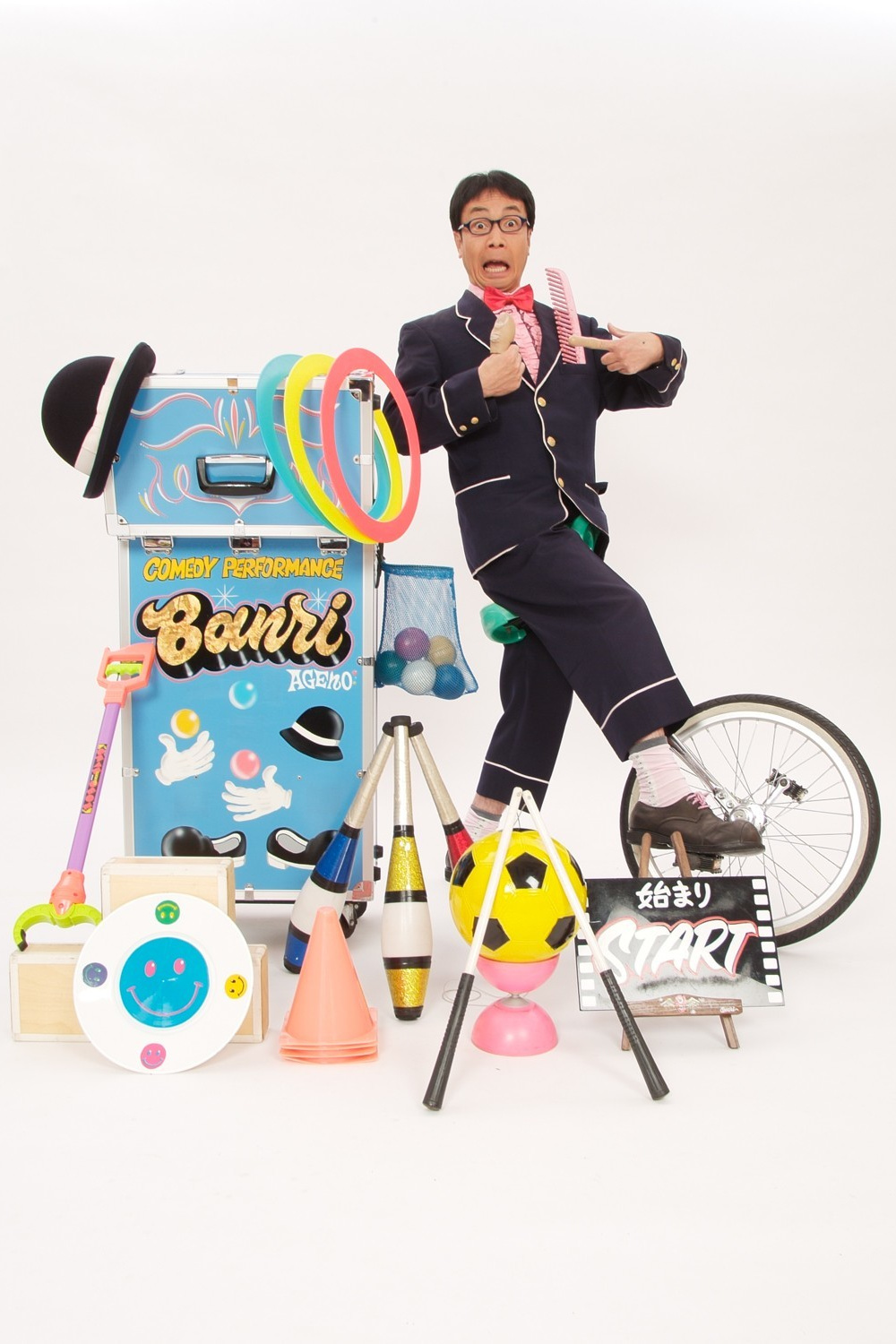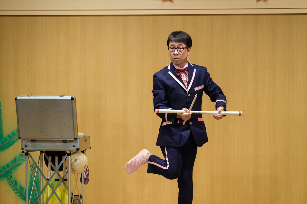 ジャグリング・バルーン・一輪車などに愉快なトークを交え、コミカルでほのぼのするコメディパフォーマンスショー・お笑い曲芸を展開します。