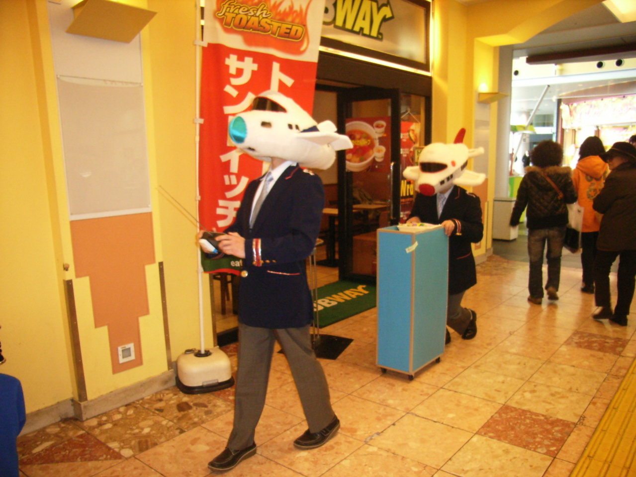 アテンションプリーズ!飛行機人間なキャビンアテンダントたちが、行く先々で引き起こしてゆく回遊型パフォーマンス。お客様とのコミュニケーションをハプニングに変えてゆきます。